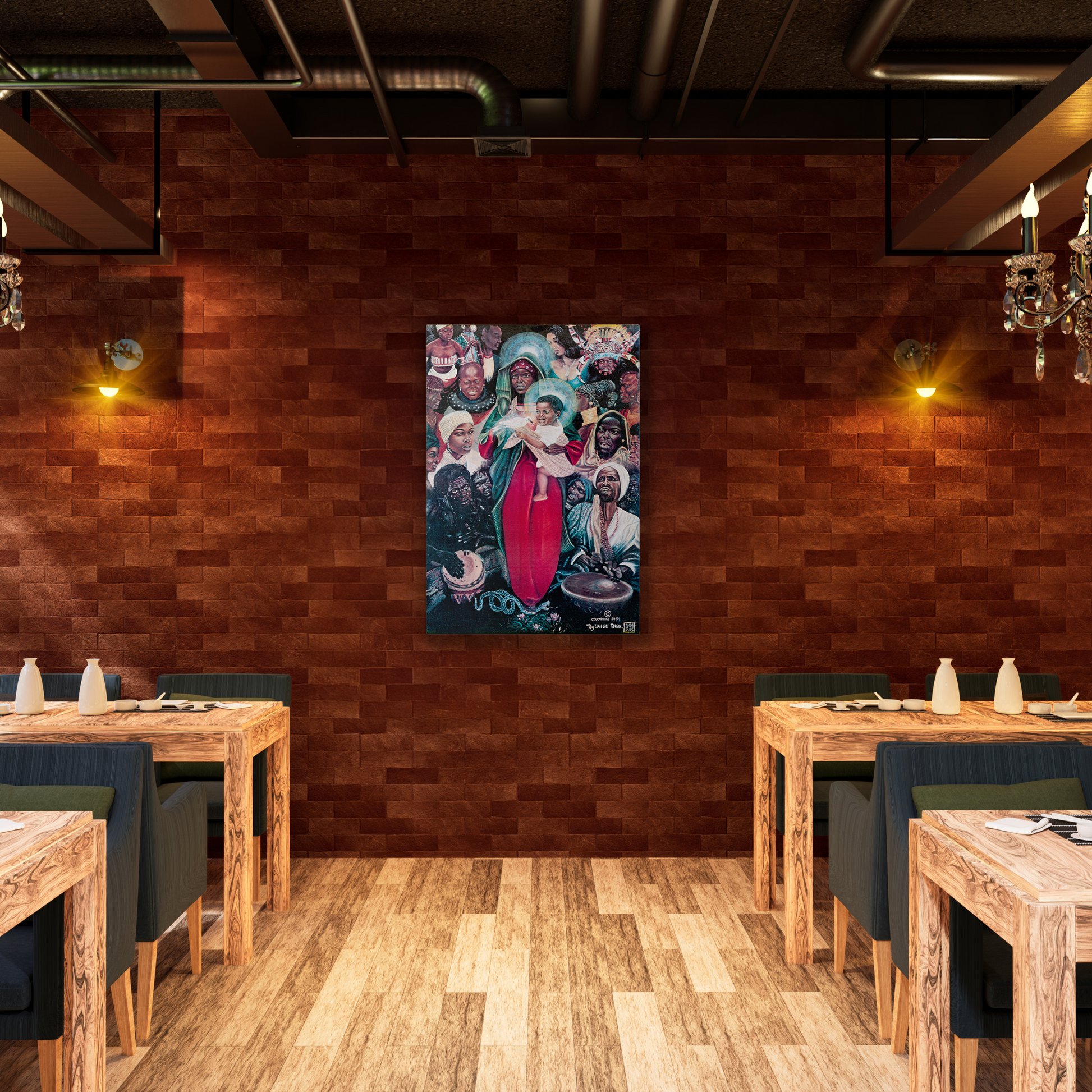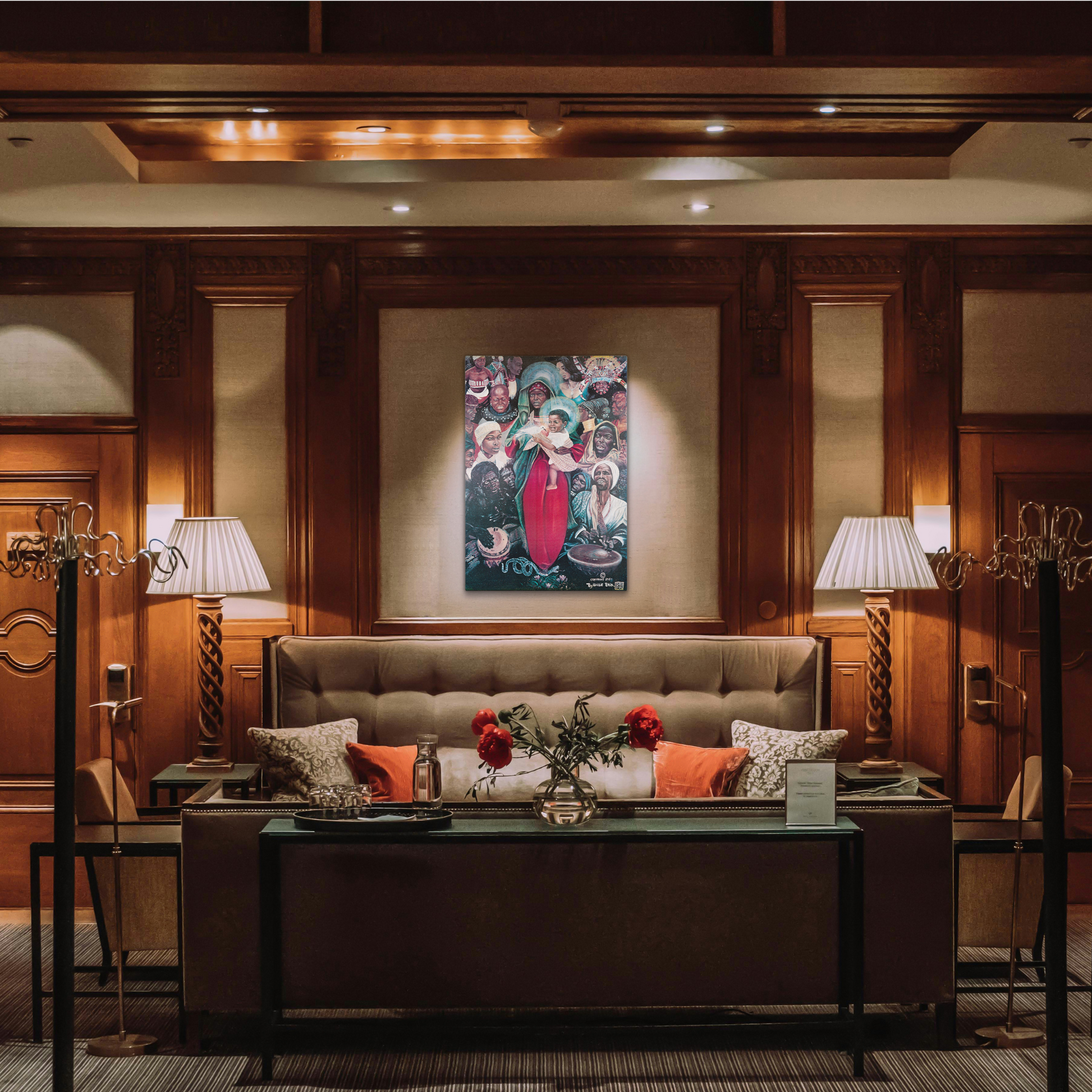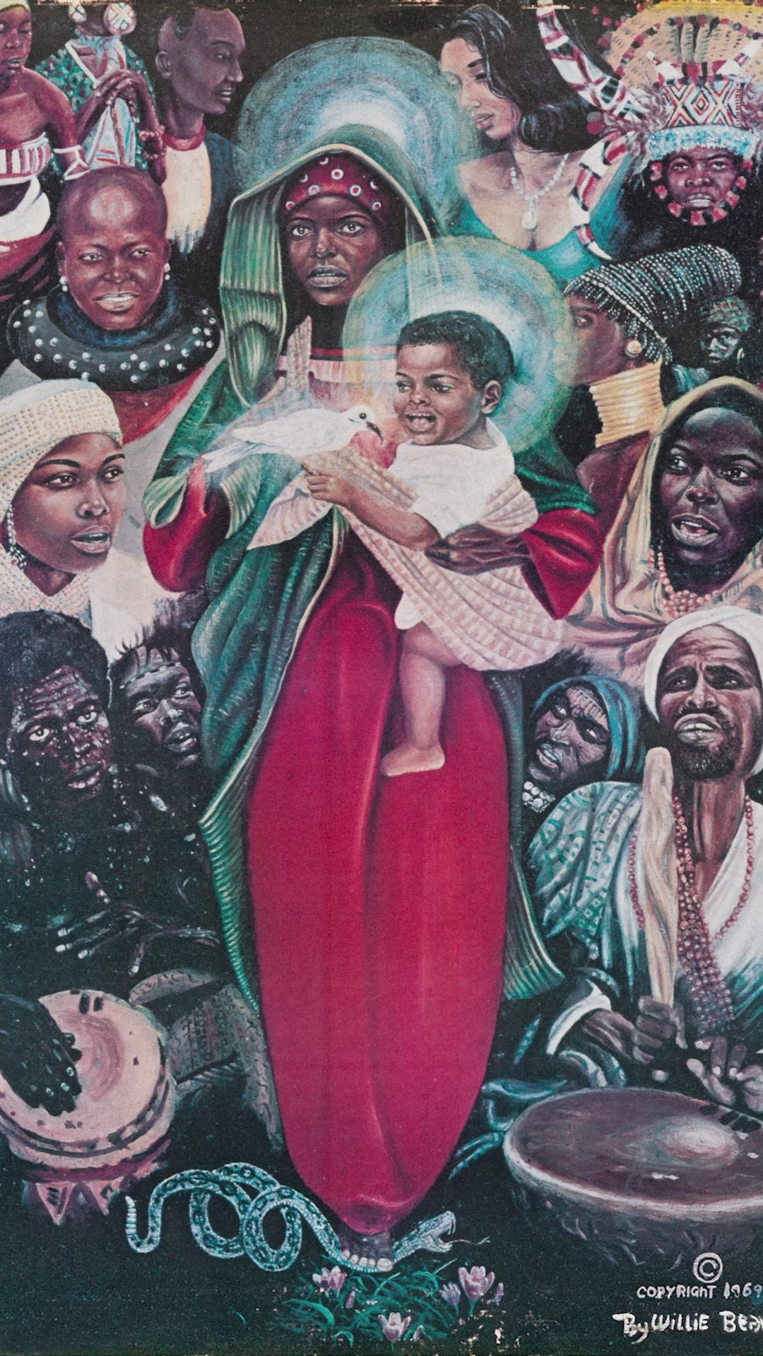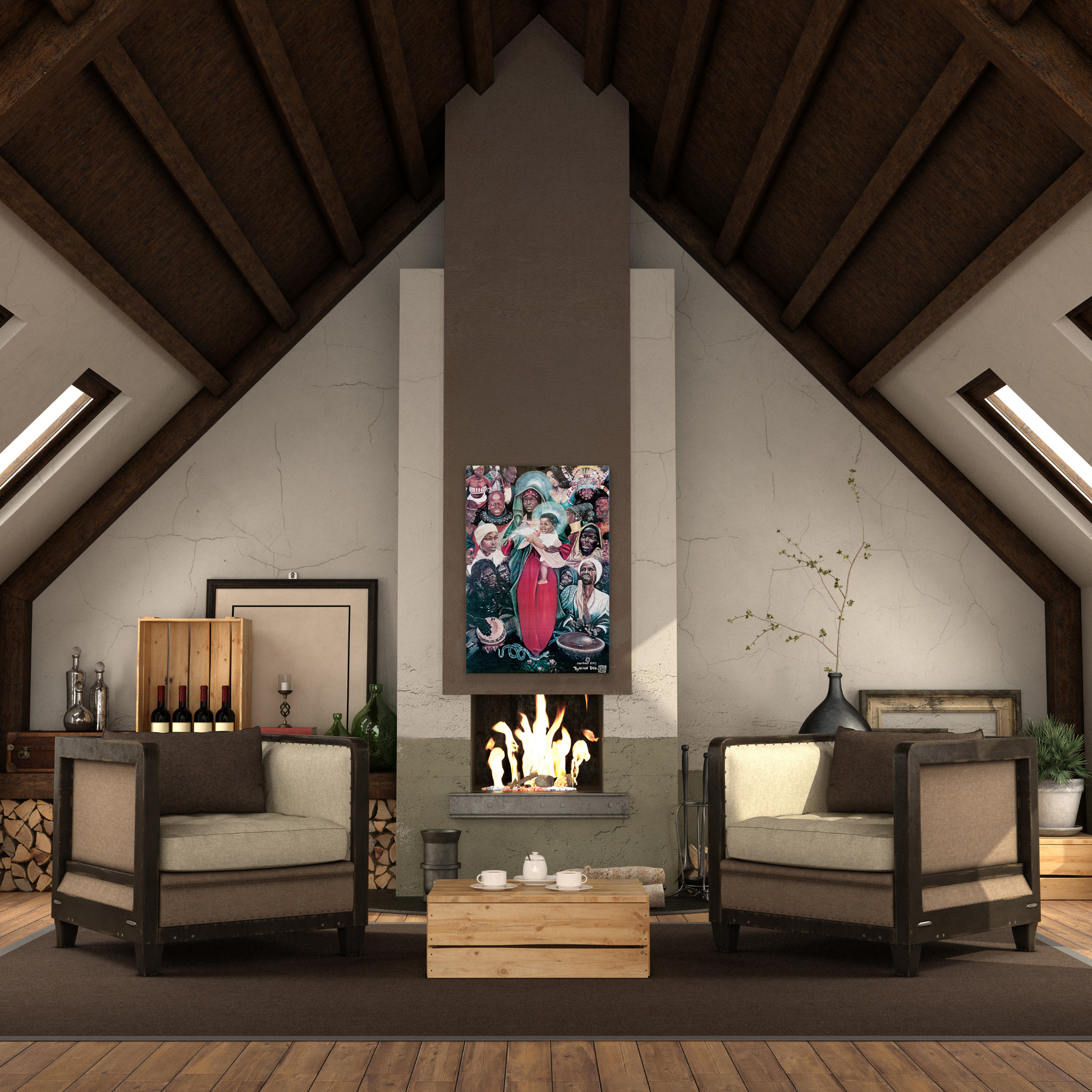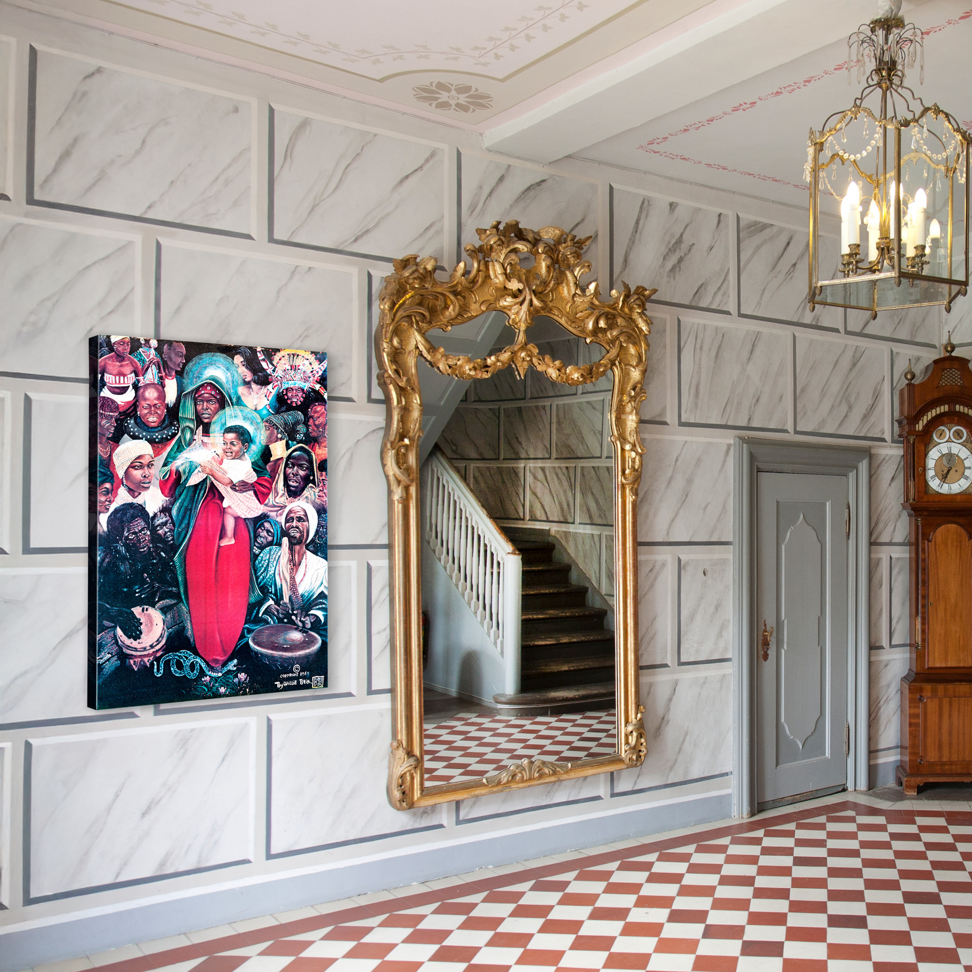 Crafted by the visionary artist Willie Beal (1969), this artwork reimagines the sacred Madonna and Child through the powerful lens of African identity. Surrounded by figures representing diverse African traditions, this image radiates unity, strength, and ancestral wisdom. The Madonna, draped in vibrant hues, gazes with a soulful intensity, while the Christ Child, holding a white dove, symbolizes hope and peace for all humankind.